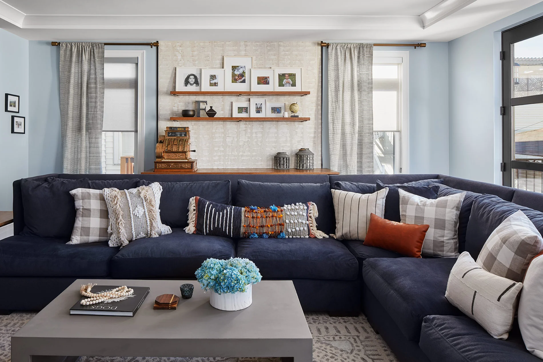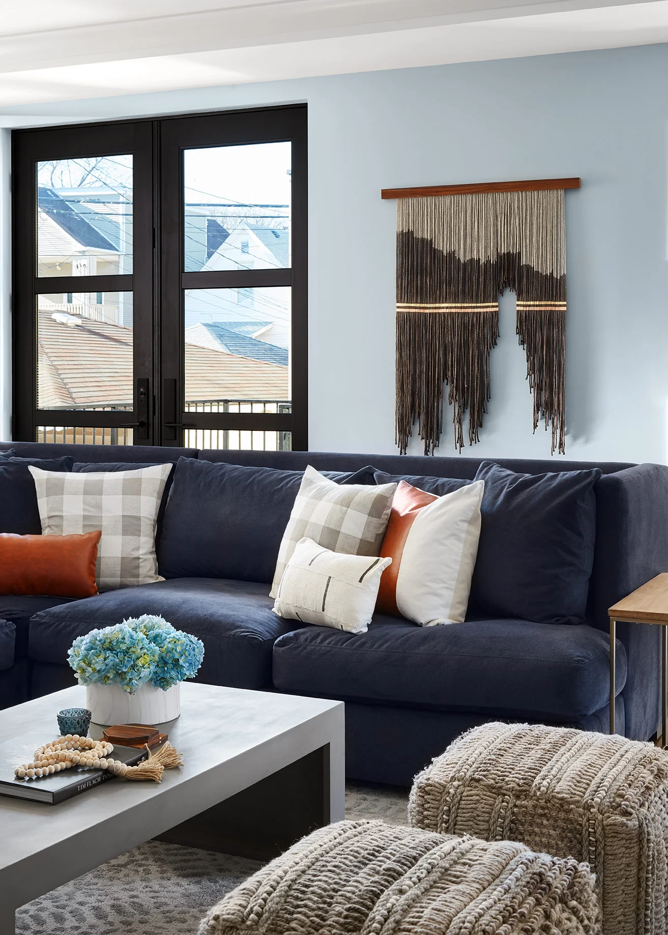 Moving into the family room, we pulled in a huge corner sectional from Lee Industries upholstered with a denim-look fabric to suggest a more casual atmosphere. We loaded the sectional with textural throw pillows to add some playfulness. To round out the seating, we included some cane accent chairs and hand-knit poufs in front of the fireplace. Grounding everything together is a cast-concrete coffee table to tie in with the concrete-look tiles on the mudroom floor.