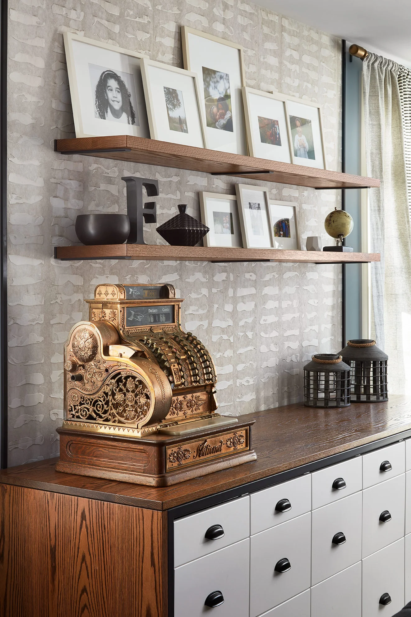 Most importantly, along the side wall, we created a custom built-in with Ganas Manufacturing, reinforced with steel supports to showcase the family cash register. The reclaimed wood top mimics the wood incorporated in the mudroom built-ins while the black steel supports allude to the doors. Vintage cabinet pulls tie into the delicate curves and sculptural forms of the register, creating a larger unit altogether. Behind the built-in, we installed a hand-painted wallcovering by Vahallan, reminiscent of a wall stripped of tiles. Reclaimed wood floating shelves provide space for the family to display photos and other significant pieces.