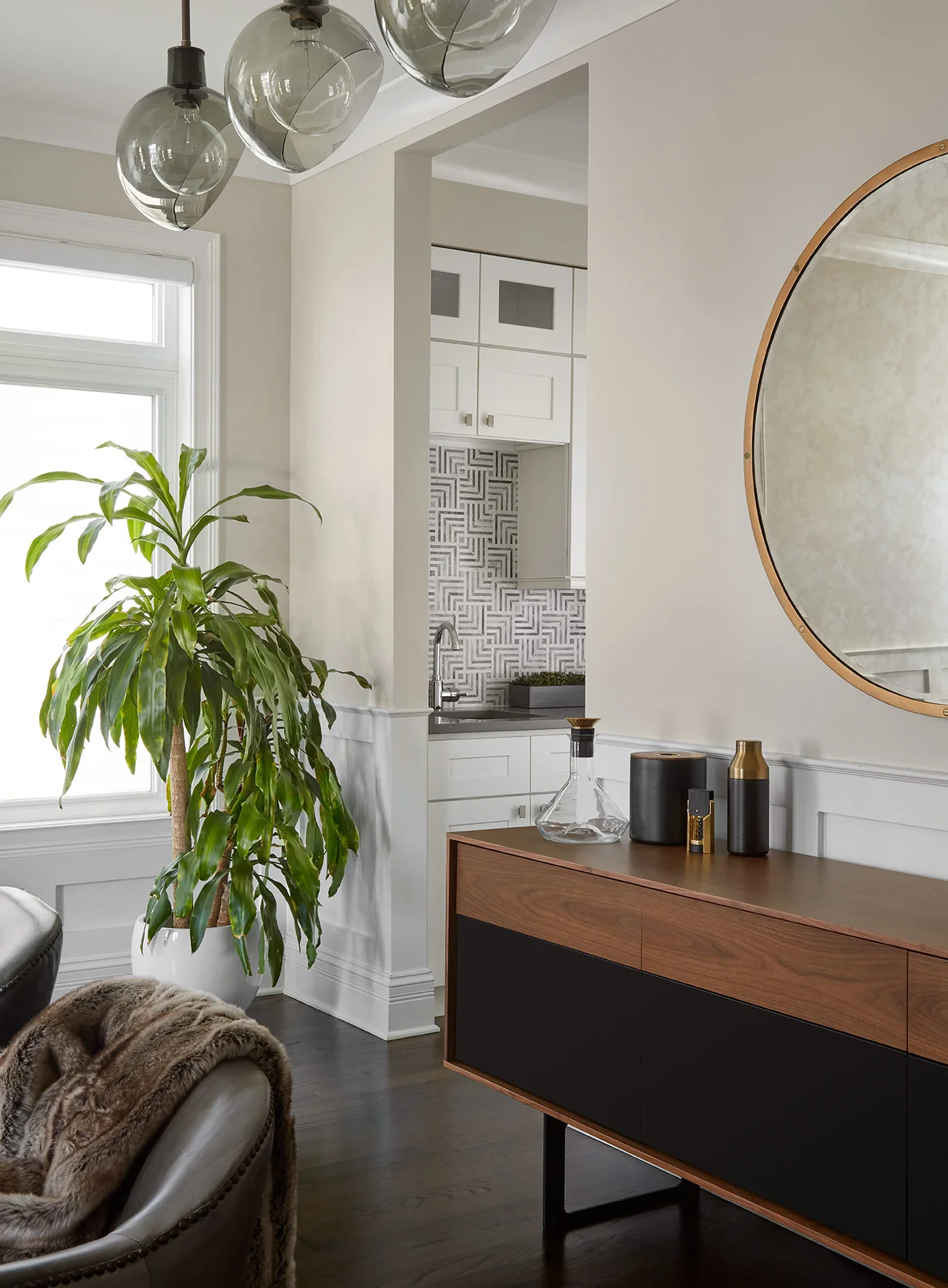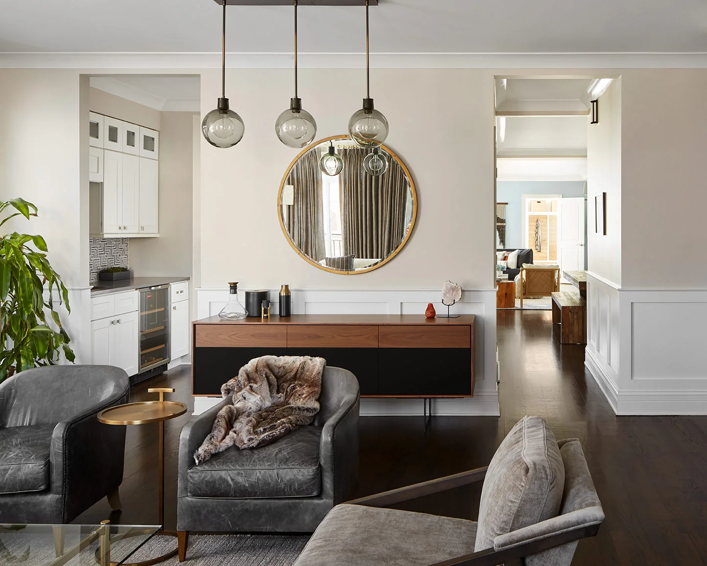 In the front of the house, we worked with some existing pieces and helped the client’s complete their living room after removing the dining table. We replaced the table and chandelier with a credenza and pendant lights to create a bar area for entertaining. In the living room, we pulled in sculptural accent chairs that tied in with the existing color palette will alluding to the silhouettes of the chairs in the family room.
