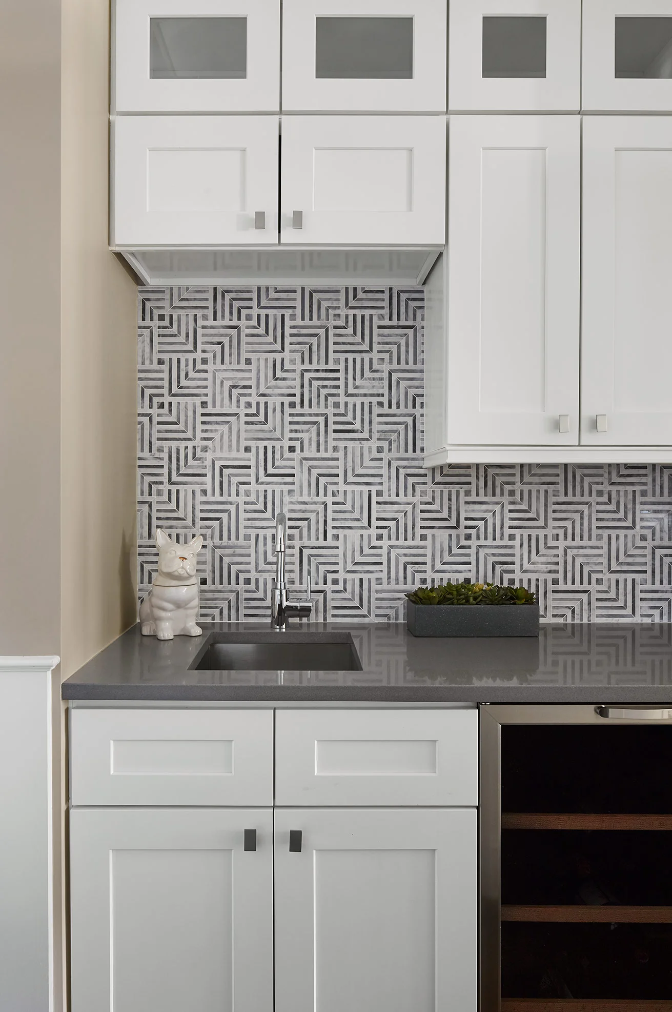 Lastly, in the butler’s pantry, we installed a geometric accent tile by Ann Sacks to add some interest and speak to the angular herringbone patterns in the kitchen and mudroom.
