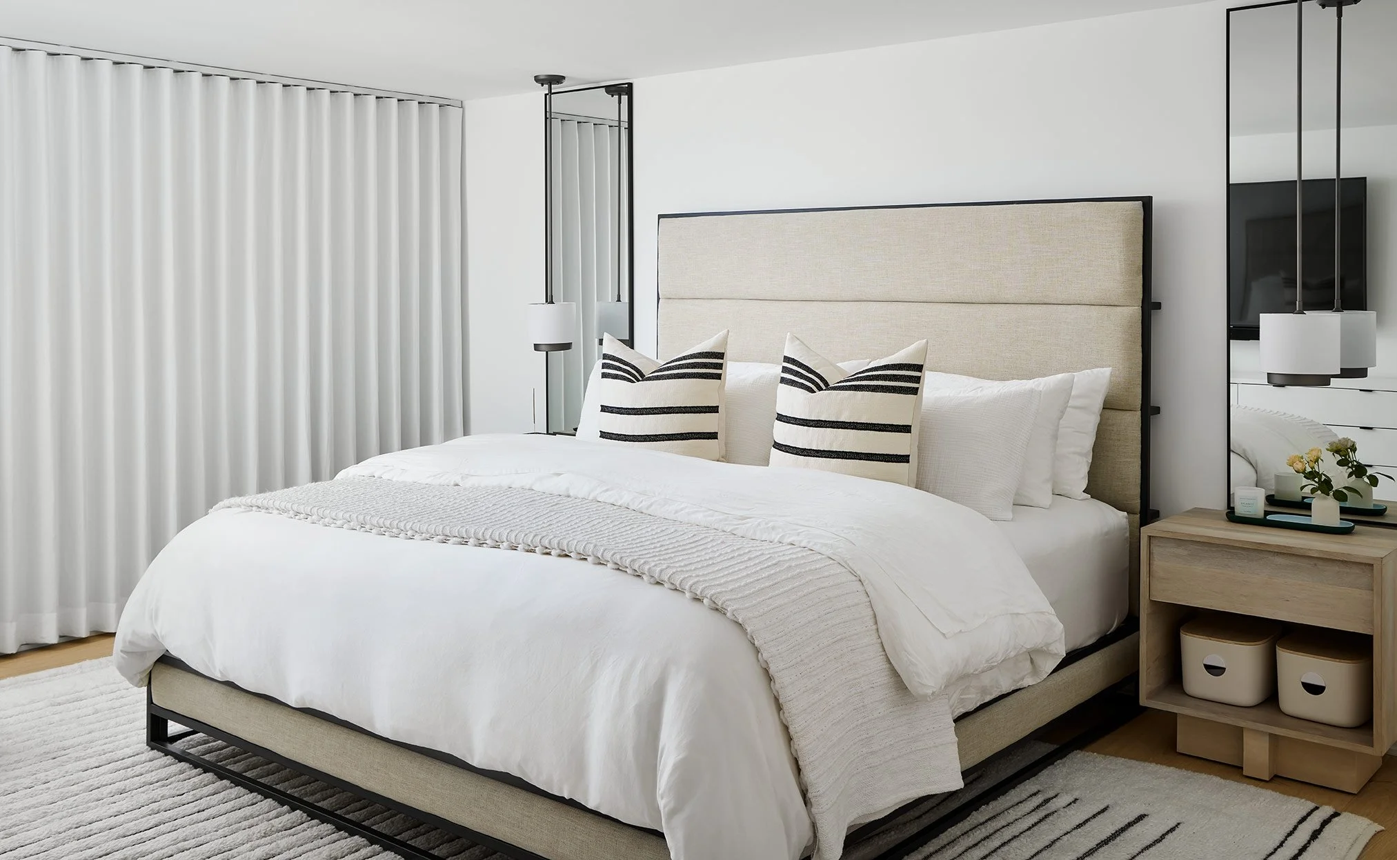 In the primary bedroom, Devon and Mike opted for a light and airy feel with a linear motif to add dimension and contrast.