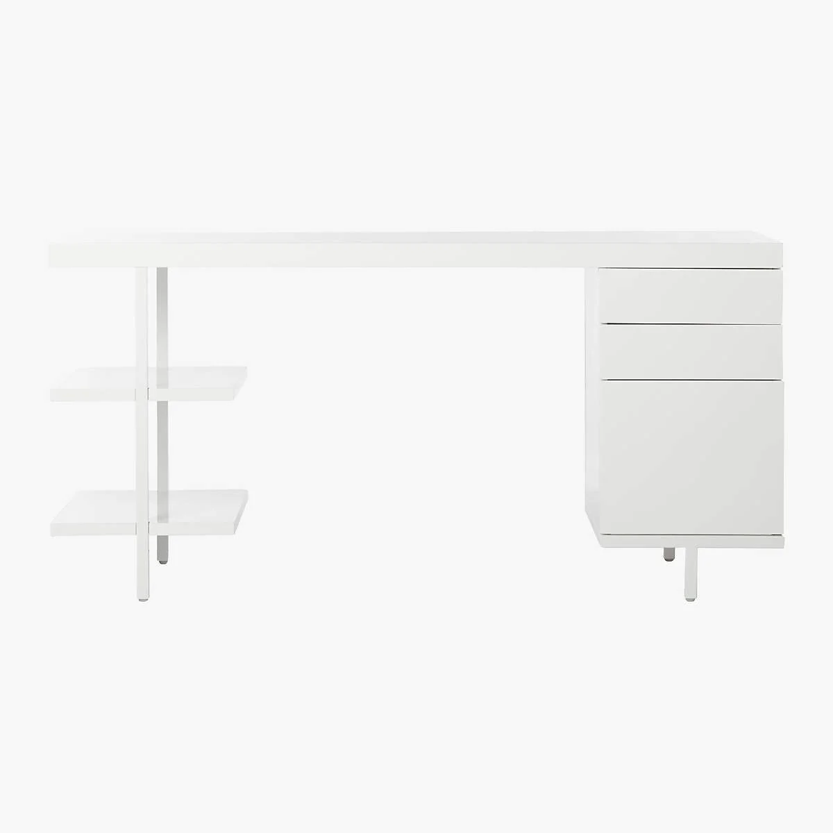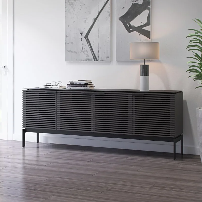 In the living room, a large corner sectional anchors the space with a custom marble coffee table to add dimension. Between the living room and dining room, a fluted wood credenza provides additional storage and adds some contrast.
